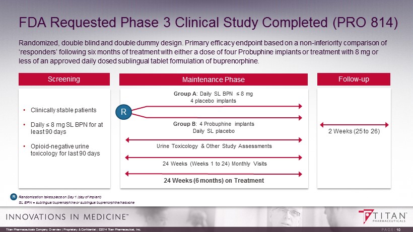 • Six clinical studies completed and NDA submitted in October 2012 • Initial small dose finding study • Two well controlled Phase 3 safety and efficacy studies showing clinical and statistical superiority over placebo and non - inferiority to Suboxone published in Journal of American Medical Association and in the journal Addiction • Two open label long - term treatment safety studies and one relative bioavailability study • Mild to moderate adverse events typical of the safety profile of buprenorphine; low number of serious adverse events similar to placebo • Well tolerated implant procedure with no evidence of implant diversion or misuse • NDA accepted for Priority Review in January 2013 • Positive advisory committee vote (10 - 4 for approval) in March 2013 • Receipt of CRL in April 2013 requesting additional clinical testing and a few other items Titan Pharmaceuticals Company Overview | Proprietary & Confidential | ©2014 Titan Pharmaceutical, Inc. 9 Probuphine Clinical and Regulatory Summary