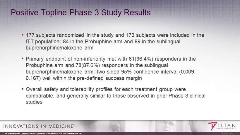 FDA Requested Phase 3 Clinical Study Completed (PRO 814) Randomized , double blind and double dummy design. Primary efficacy endpoint based on a non - inferiority comparison of ‘responders’ following six months of treatment with either a dose of four Probuphine implants or treatment with 8 mg or less of an approved daily dosed sublingual tablet formulation of buprenorphine . 10 Titan Pharmaceuticals Company Overview | Proprietary & Confidential | ©2014 Titan Pharmaceutical, Inc. 24 Weeks (Weeks 1 to 24 ) Monthly Visits Group A : Daily SL BPN ≤ 8 mg 4 placebo implants • Clinically stable patients • Daily ≤ 8 mg SL BPN for at least 90 days • Opioid - negative urine toxicology for last 90 days 2 Weeks ( 25 to 26) 24 Weeks (6 months) on Treatment Urine Toxicology & Other Study Assessments Group B : 4 Probuphine implants Daily SL placebo Randomization takes place on Day 1 (day of implant ) SL BPN = sublingual buprenorphine or sublingual buprenorphine/naloxone Screening Maintenance Phase Follow - up R R