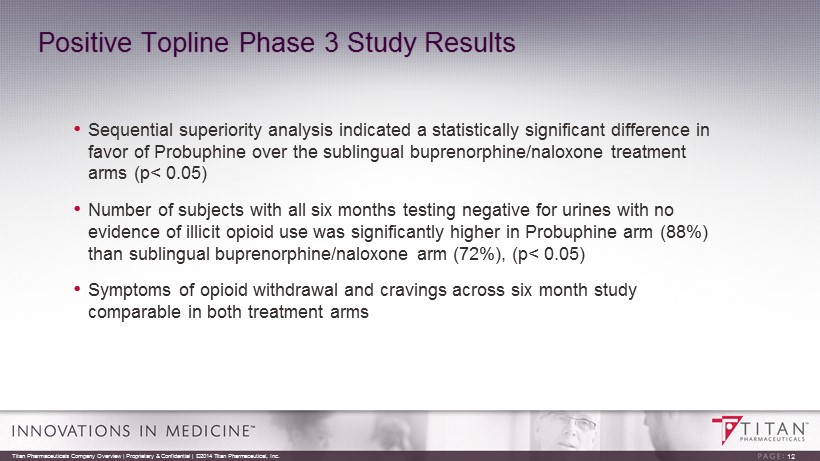 Positive Topline Phase 3 Study Results Titan Pharmaceuticals Company Overview | Proprietary & Confidential | ©2014 Titan Pharmaceutical, Inc. 11 • 177 subjects randomized in the study and 173 subjects were included in the ITT population; 84 in the Probuphine arm and 89 in the sublingual buprenorphine/naloxone arm • Primary endpoint of non - inferiority met with 81(96.4%) responders in the Probuphine arm and 78(87.6%) responders in the sublingual buprenorphine/naloxone arm; two - sided 95% confidence interval (0.009, 0.167) well within the pre - defined success margin • Overall safety and tolerability profiles for each treatment group were comparable, and generally similar to those observed in prior Phase 3 clinical studies