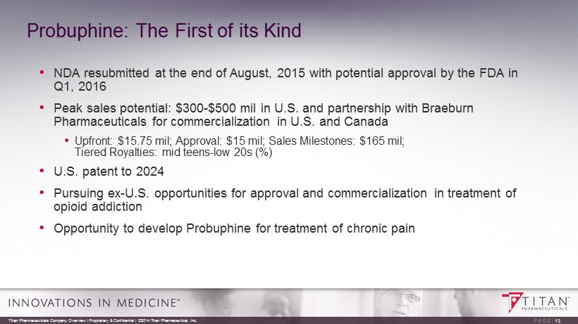 Positive Topline Phase 3 Study Results • Sequential superiority analysis indicated a statistically significant difference in favor of Probuphine over the sublingual buprenorphine/naloxone treatment arms (p< 0.05) • Number of subjects with all six months testing negative for urines with no evidence of illicit opioid use was significantly higher in Probuphine arm (88%) than sublingual buprenorphine/naloxone arm (72%), (p< 0.05) • Symptoms of opioid withdrawal and cravings across six month study comparable in both treatment arms 12 Titan Pharmaceuticals Company Overview | Proprietary & Confidential | ©2014 Titan Pharmaceutical, Inc.
