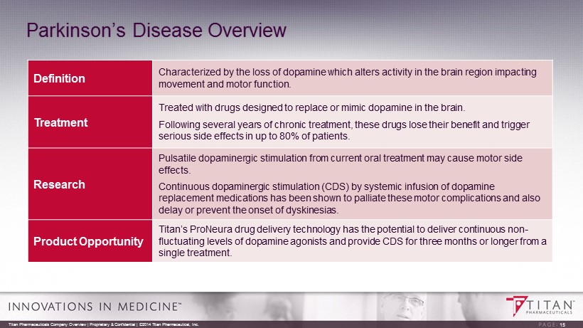 Titan: Adding Value Beyond Probuphine Proprietary ProNeura Technology Platform • Long term drug delivery technology validated through the Probuphine program • Potential for the treatment of select chronic diseases for which low dose long term delivery and stable drug levels may offer advantages over oral administration • Product development program in Parkinson’s disease (PD) in progress • Evaluation of additional compounds in other chronic disease settings under way 14 Titan Pharmaceuticals Company Overview | Proprietary & Confidential | ©2014 Titan Pharmaceutical, Inc.