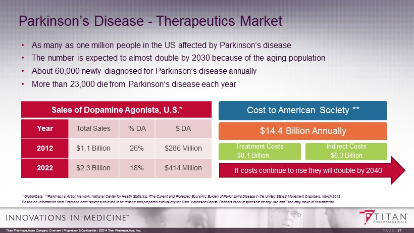 Parkinson’s Disease Population Increasing Worldwide 16 Based on information from Titan and other sources believed to be reliable and prepared exclusively for Titan. Woodside Capita l P artners is not responsible for any use that Titan may make of this material. Titan Pharmaceuticals Company Overview | Proprietary & Confidential | ©2014 Titan Pharmaceutical, Inc.