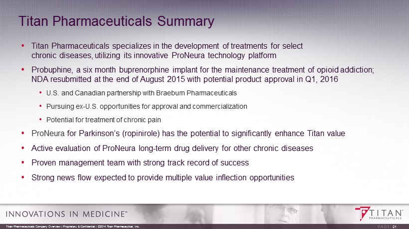 ProNeura : Building a Product Pipeline • The ProNeura platform is ideal for the treatment of select chronic diseases for which low dose, long term treatment with stable drug levels may offer advantages over oral administration, diseases such as • Hormonal Deficiencies • Type 2 Diabetes • Attention Deficit Hyperactivity Disorder • Benign Prostate Hyperplasia • Pre - exposure prophylaxis therapy for HIV - 1 prevention • Titan is reviewing potential compounds that fit the ProNeura implant profile and conducting early feasibility experiments with the goal to add at least one more product to the pipeline in the next few months • Titan plans to explore other opportunities for the delivery of proprietary compounds through joint development projects or potential licensing of the P roNeura technology to other companies 20 Titan Pharmaceuticals Company Overview | Proprietary & Confidential | ©2014 Titan Pharmaceutical, Inc.