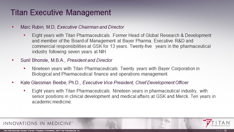 • Marc Rubin, M.D, Executive Chairman and Director • Eight years with Titan Pharmaceuticals. Former Head of Global Research & Development and member of the Board of Management at Bayer Pharma. Executive R&D and commercial responsibilities at GSK for 13 years. Twenty - five years in the pharmaceutical industry following seven years at NIH. • Sunil Bhonsle, M.B.A., President and Director • Nineteen years with Titan Pharmaceuticals. Twenty years with Bayer Corporation in Biological and Pharmaceutical finance and operations management. • Kate Glassman Beebe, Ph.D., Executive Vice President, Chief Development Officer • Eight years with Titan Pharmaceuticals. Nineteen years in pharmaceutical industry, with senior positions in clinical development and medical affairs at GSK and Merck. Ten years in academic medicine. Titan Executive Management Titan Pharmaceuticals Company Overview | Proprietary & Confidential | ©2014 Titan Pharmaceutical, Inc. 22