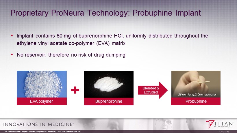 Opioid Addiction: Treatment Overview • Buprenorphine pharmacology makes it an effective, safer and more convenient treatment option • Controls withdrawal symptoms and cravings without inducing opioid euphoria in patients • Convenient outpatient treatment allowing take home medication, unlike methadone • Low risk of respiratory depression compared to other opiates • Buprenorphine treatment is the gold standard in the U.S. • Annual U.S. sales of daily dosed formulations approaching $1.8 billion • Challenges with daily dosed formulations • Compliance • Sublingual dosing results in variable blood levels • Diversion and abuse Titan Pharmaceuticals Company Overview | Proprietary & Confidential | ©2014 Titan Pharmaceutical, Inc. 5 0 500 1000 1500 2000 Buprenorphine Sales By Year Buprenorphine sales ($,000)
