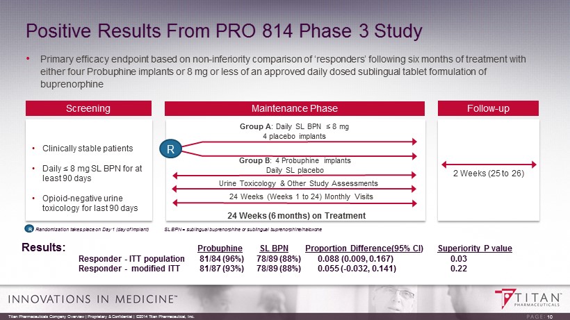 • Six clinical studies completed and NDA submitted in October 2012 • NDA accepted for Priority Review in January 2013 • Positive advisory committee vote (10 - 4 for approval) in March 2013 • Receipt of CRL in April 2013 requesting additional clinical testing and a few other items • Additional Phase 3 study, as requested by FDA • A randomized, double blind, double dummy study evaluating a dose of four Probuphine implants in stable patients who have been receiving maintenance therapy at a dose of 8mg/day or less of buprenorphine. The primary efficacy analysis will be a non - inferiority comparison between the two arms. • Trial enrollment initiated in July 2014 and completed in November 2014 • Study enrolled 177 subjects who were randomized to receive either the Probuphine implants or sublingual tablets for a treatment period of six months Titan Pharmaceuticals Company Overview | Proprietary & Confidential | ©2014 Titan Pharmaceutical, Inc. 9 Probuphine Clinical and Regulatory Background