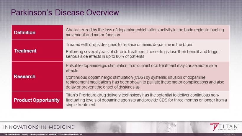 Titan: Adding Value Beyond Probuphine Proprietary ProNeura Technology Platform • Long - term drug delivery technology validated through the Probuphine program • Potential for the treatment of select chronic diseases for which low dose, long - term delivery and stable drug levels may offer advantages over other forms of administration • Product development programs in progress: • Ropinirole implant for the treatment of Parkinson’s disease (PD) • Triidothyronine (T3) implant for the treatment of hypothyroidism • Conducting feasibility evaluation of additional compounds in other chronic disease settings to add to the product pipeline • Benign Prostate Hyperplasia, Pre - exposure prophylaxis therapy for HIV - 1 prevention, Type 2 Diabetes, Attention Deficit Hyperactivity Disorder 13 Titan Pharmaceuticals Company Overview | Proprietary & Confidential | ©2014 Titan Pharmaceutical, Inc.