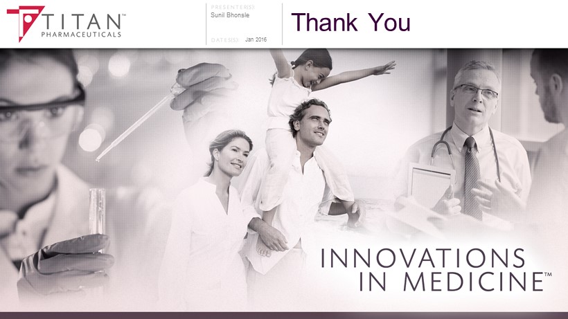 Forward - Looking Statements The presentation may contain “forward - looking statements” within the meaning of Section 27A of the Securities Act of 1933 and Section 21E of the Securities Exchange Act of 1934. Reference is made in particular to the description of our plans and objectives for future operations, assumptions underlying such plans and objectives and other forward - looking terminology such as “may,” “expects,” “believes,” “anticipates,” “intends,” “projects,” or similar terms, variations of such terms or the negative of such terms. Forward - looking statements are based on management’s current expectations. Actual results could differ materially from those currently anticipated and such statements involve risks and uncertainties, including, but not limited to, those risks and uncertainties relating to availability of financing, difficulties or delays in development, testing, regulatory approval, production and marketing of the Company's drug candidates, adverse side effects or inadequate therapeutic efficacy of the Company's drug candidates that could slow or prevent product development or commercialization and the uncertainty of patent protection for the Company's intellectual property or trade secrets. Titan Pharmaceuticals Company Overview | Proprietary & Confidential | ©2014 Titan Pharmaceutical, Inc. 2