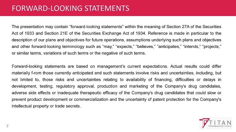 FORWARD - LOOKING STATEMENTS The presentation may contain “forward - looking statements” within the meaning of Section 27 A of the Securities Act of 1933 and Section 21 E of the Securities Exchange Act of 1934 . Reference is made in particular to the description of our plans and objectives for future operations, assumptions underlying such plans and objectives and other forward - looking terminology such as “may,” “expects,” “believes,” “anticipates,” “intends,” “projects,” or similar terms, variations of such terms or the negative of such terms . Forward - looking statements are based on management’s current expectations . Actual results could differ materially f - rom those currently anticipated and such statements involve risks and uncertainties, including, but not limited to, those risks and uncertainties relating to availability of financing, difficulties or delays in development, testing, regulatory approval, production and marketing of the Company's drug candidates, adverse side effects or inadequate therapeutic efficacy of the Company's drug candidates that could slow or prevent product development or commercialization and the uncertainty of patent protection for the Company's intellectual property or trade secrets . 2