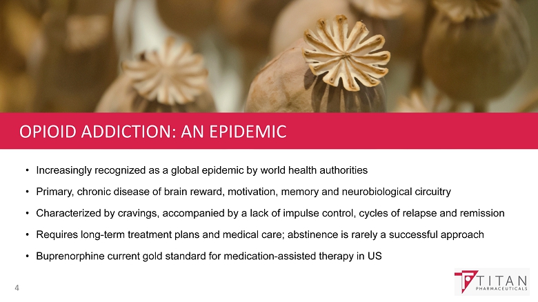 COMPANY SNAPSHOT 3 • Focus on proprietary therapeutics for select chronic diseases • ProNeura TM drug delivery platform provides long - term, continuous, non - fluctuating medication levels • Probuphine® (buprenorphine) implant – six - month maintenance treatment of opioid addiction • FDA approval May 2016 • Large and growing market opportunity; significant unmet medical need • Product pipeline: Ropinirole implant for Parkinson’s disease and T3 implant for Hypothyroidism • Strong Cash Position to Support Near - term Development Activities