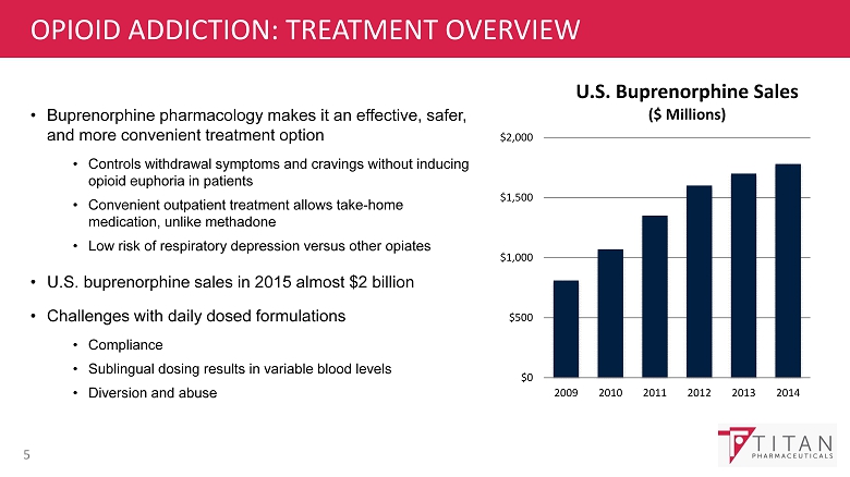 OPIOID ADDICTION: AN EPIDEMIC • Increasingly recognized as a global epidemic by world health authorities • Primary, chronic disease of brain reward, motivation, memory and neurobiological circuitry • Characterized by cravings, accompanied by a lack of impulse control, cycles of relapse and remission • Requires long - term treatment plans and medical care; abstinence is rarely a successful approach • Buprenorphine current gold standard for medication - assisted therapy in US 4