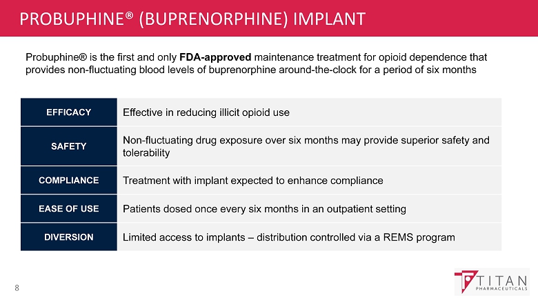 PROBUPHINE® ADMINISTRATION 7 • Inserted subdermally in the inner side of the upper arm by a certified health care provider • Drug is released continuously into patient's body through the process of dissolution • Results in a stable level of medication in the blood, avoiding peaks and troughs of oral dosing