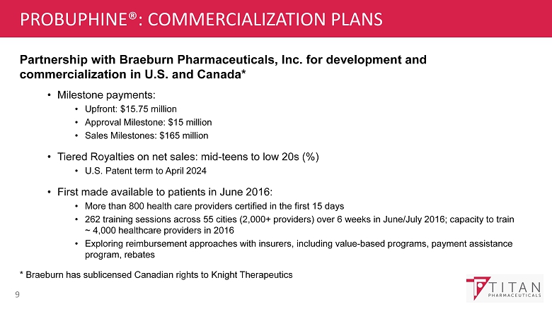 PROBUPHINE® (BUPRENORPHINE) IMPLANT 8 Probuphine® is the first and only FDA - approved maintenance treatment for opioid dependence that provides non - fluctuating blood levels of buprenorphine around - the - clock for a period of six months EFFICACY Effective in reducing illicit opioid use SAFETY Non - fluctuating drug exposure over six months may provide superior safety and tolerability COMPLIANCE Treatment with implant expected to enhance compliance EASE OF USE Patients dosed once every six months in an outpatient setting DIVERSION Limited access to implants – distribution controlled via a REMS program