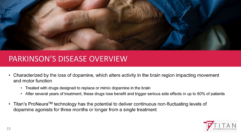 PRONEURA: ADDING VALUE BEYOND PROBUPHINE® 14 • Long - term drug delivery technology validated through the Probuphine® program • Potential for the treatment of select chronic diseases for which low dose, long - term delivery and stable drug levels may offer advantages over other forms of administration • Product development programs in progress: • Ropinirole implant for the treatment of Parkinson’s disease (PD) • Triiodothyronine (T3) implant for the treatment of hypothyroidism • Conducting feasibility evaluation of additional compounds in other chronic disease settings to add to the product pipeline • Goal is to pursue commercial partnerships for product candidates at appropriate stages of development, and potential licensing agreements with other pharmaceutical companies for ProNeura - based technology