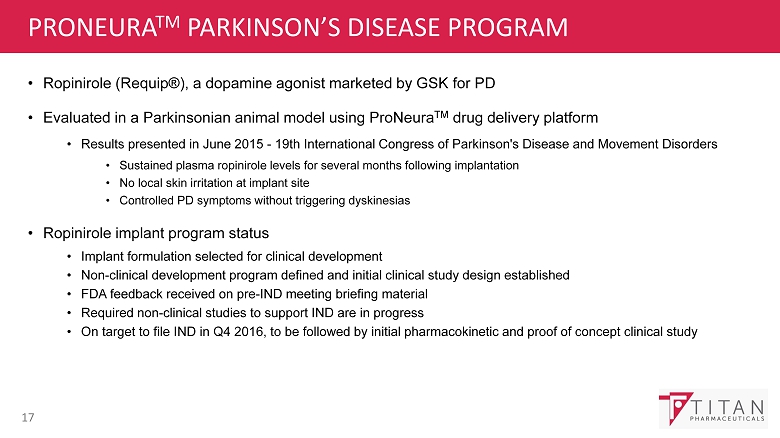 PARKINSON’S DISEASE – THERAPEUTICS MARKET 16 * GlobalData; **Parkinson’s Action Network, National Center for Health Statistics; “The Current and Projected Economic Burden of Parkinson’s Disease in the United States” Movement Disorders, March 2013 Based on information from Titan and other sources believed to be reliable and prepared exclusively for Titan. Woodside Capita l P artners is not responsible for any use that Titan may make of this material. Sales of Dopamine Agonists, U.S.* Year Total Sales % DA $ DA 2012 $1.1 Billion 26% $286 Million 2022 $2.3 Billion 18% $414 Million Cost to American Society ** $14.4 Billion Annually Treatment Costs $8.1 Billion Indirect Costs $6.3 Billion If costs continue to rise they will double by 2040 • As many as 1 million people in the US affected • That number is expected to almost double by 2030 due to aging of population • About 60 , 000 newly diagnosed for PD annually • More than 23 , 000 die from PD each year