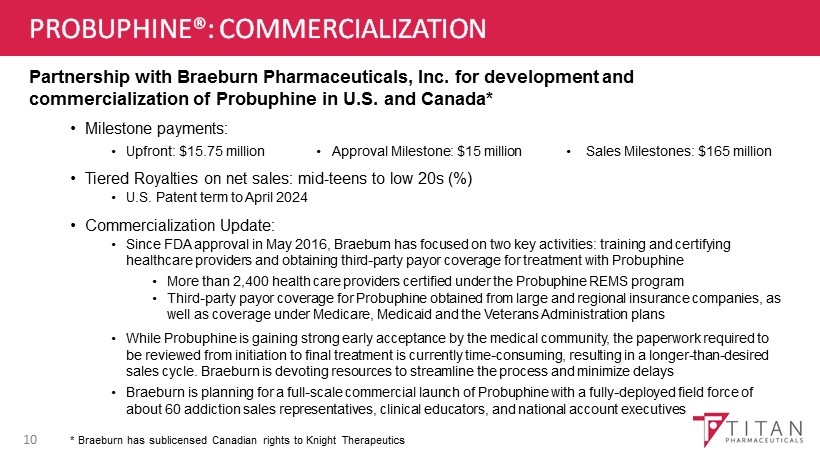 PROBUPHINE®: RISK EVALUATION & MITIGATION STRATEGY 9 • Training and Certification – Providers who prescribe and implant Probuphine will: • A ttend Live Training: Lecture and Practicum • C omplete the Probuphine REMS P rogram K nowledge Assessment • B e enrolled in the Probuphine REMS program • Providers who will perform Probuphine surgical procedures must meet criteria for procedural competency • Recertification will be required after 12 months, prior to placement of any additional orders. • Patient Counseling – Patients will be counseled regarding risks of accidental overdose, misuse, and abuse, and when they might need to contact their healthcare provider • Closed Distribution – Probuphine will only be available to healthcare providers who have been certified in the Probuphine REMS Program