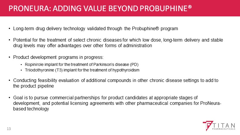 PROBUPHINE®: EX - U.S. PARTNERING PLANS 12 • Pursuing ex - U.S. opportunities in opioid addiction treatment • Due diligence by interested companies in select regions is in progress • Scientific and regulatory discussions with select European countries scheduled in late fourth quarter of 2016 • Opportunity to further develop Probuphine® for treatment of chronic pain