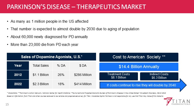 PARKINSON’S DISEASE OVERVIEW • Characterized by the loss of dopamine, which alters activity in the brain region impacting movement and motor function • Treated with drugs designed to replace or mimic dopamine in the brain • After several years of treatment , these drugs lose benefit and trigger serious side effects in up to 80% of patients • Titan’s ProNeura TM technology has the potential to deliver continuous non - fluctuating levels of dopamine agonists for three months or longer from a single treatment 14