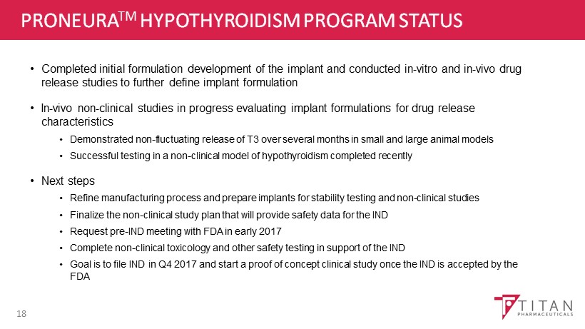 HYPOTHYROIDISM DISEASE OVERVIEW • Thyroid gland does not make enough thyroid hormone to meet body’s need • Typical treatment consists of synthetic prohormone thyroxine (T4) given orally once a day, which is converted by the body to the active triiodothyronine (T3) • Oral T3 treatment is effective, but comes with potential side effects caused by blood level fluctuations • ProNeura TM platform has potential to deliver continuous, non - fluctuating levels of T3 and provide a stable blood level for several months following a single treatment 17