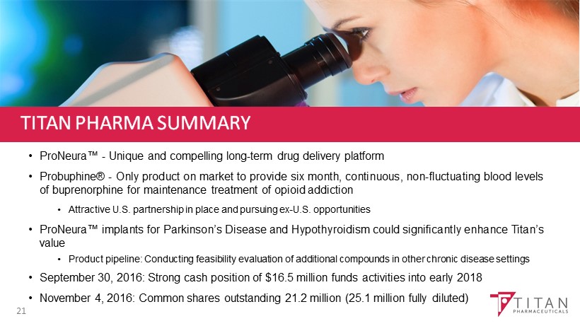 TITAN PHARMA SUMMARY • ProNeura ™ - Unique and compelling long - term drug delivery platform • Probuphine ® - Only product on market to provide six month, continuous, non - fluctuating blood levels of buprenorphine for maintenance treatment of opioid addiction • Attractive U . S . partnership in place and pursuing ex - U . S . opportunities • ProNeura ™ implants for Parkinson’s Disease and Hypothyroidism could significantly enhance Titan’s value • Product pipeline: Conducting feasibility evaluation of additional compounds in other chronic disease settings • September 30, 2016: Strong cash position of $16.5 million funds activities into early 2018 • November 4, 2016: Common shares outstanding 21.2 million (25.1 million fully diluted) 21