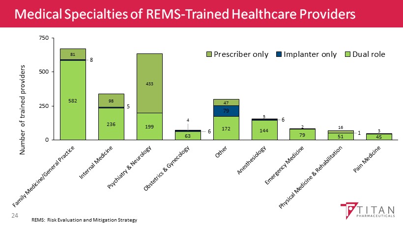 Medical Specialties of REMS - Trained Healthcare Providers 24 582 236 199 63 172 144 79 51 45 8 5 6 79 6 1 81 98 433 4 47 5 2 16 3 0 250 500 750 Prescriber only Implanter only Dual role REMS: Risk Evaluation and Mitigation Strategy Number of trained providers