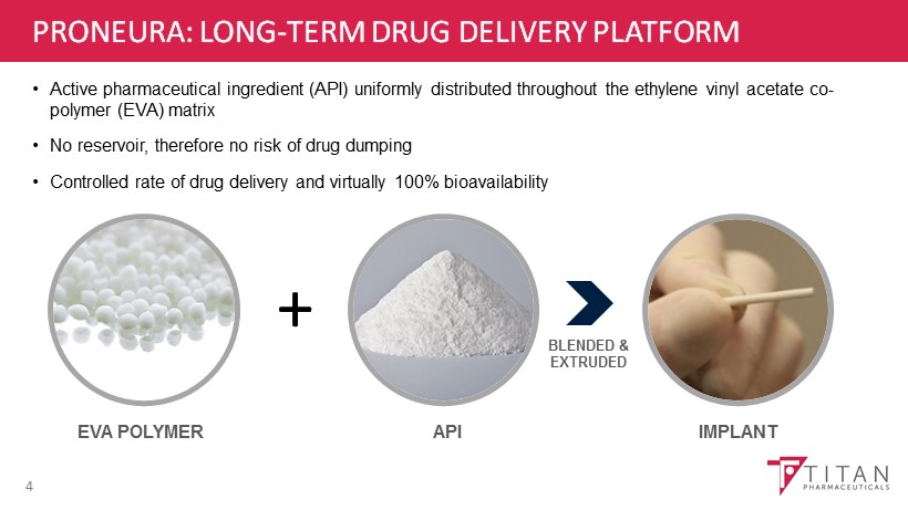 COMPANY SNAPSHOT 3 • Focus on proprietary therapeutics for select chronic diseases • ProNeura TM drug delivery platform provides long - term, continuous, non - fluctuating medication levels • FDA approved Probuphine ® (buprenorphine) implant – six - month maintenance treatment of opioid addiction • Large and growing market opportunity; Strong commercial partnership with Braeburn Pharmaceuticals • Initial product launch commenced Q3 2016 building to full - scale launch in Q1 2017 • Growing pipeline: Parkinson’s D isease, Hypothyroidism and evaluating other chronic disease targets • Strong cash position to support near - term development activities