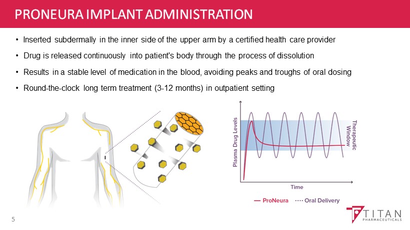 PRONEURA: LONG - TERM DRUG DELIVERY PLATFORM 4 • Active pharmaceutical ingredient (API) uniformly distributed throughout the ethylene vinyl acetate co - polymer (EVA) matrix • No reservoir, therefore no risk of drug dumping • Controlled rate of drug delivery and virtually 100% bioavailability EVA POLYMER API IMPLANT BLENDED & EXTRUDED +