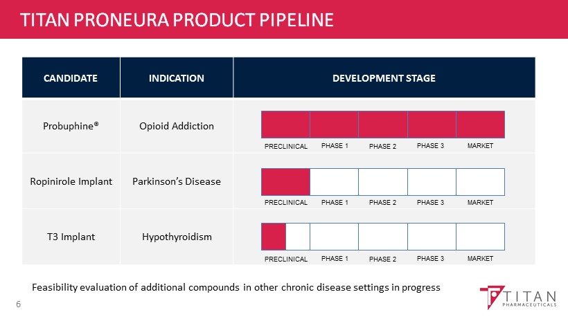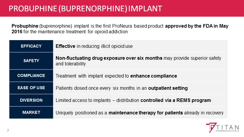 TITAN PRONEURA PRODUCT PIPELINE 6 CANDIDATE INDICATION DEVELOPMENT STAGE Probuphine ® Opioid Addiction Ropinirole Implant Parkinson’s Disease T3 Implant Hypothyroidism PRECLINICAL PHASE 1 PHASE 2 PHASE 3 MARKET PRECLINICAL PHASE 1 PHASE 2 PHASE 3 MARKET PRECLINICAL PHASE 1 PHASE 2 PHASE 3 MARKET Feasibility evaluation of additional compounds in other chronic disease settings in progress