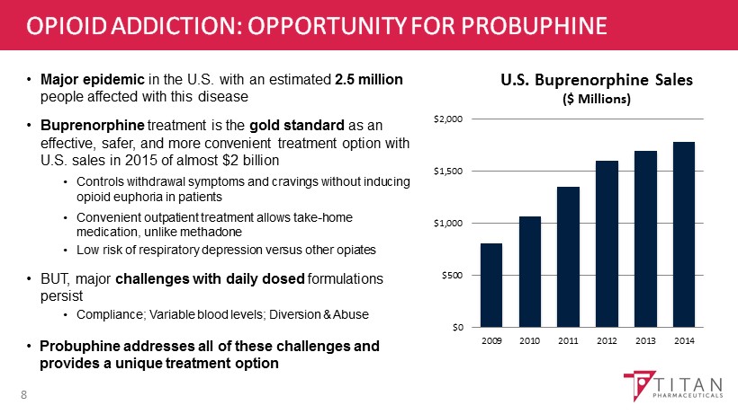 PROBUPHINE (BUPRENORPHINE) IMPLANT 7 Probuphine (buprenorphine) implant is the first ProNeura based product approved by the FDA in M ay 2016 for the maintenance treatment for opioid addiction EFFICACY Effective in reducing illicit opioid use SAFETY Non - fluctuating drug exposure over six months may provide superior safety and tolerability COMPLIANCE Treatment with implant expected to enhance compliance EASE OF USE Patients dosed once every six months in an outpatient setting DIVERSION Limited access to implants – distribution controlled via a REMS program MARKET Uniquely positioned as a maintenance therapy for patients already in recovery