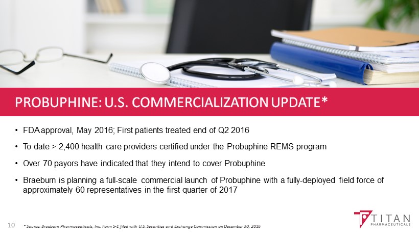 PROBUPHINE: DEVELOPMENT & COMMERCIALIZATION UPDATE Partnership 9 Partnership with Braeburn Pharma for U.S. and Canada * signed in December 2012 * Braeburn has sublicensed Canadian rights to Knight Therapeutics Milestone payments • Upfront: $15.75 million • Approval Milestone: $15 million • Sales Milestones: up to $165 million Tiered Royalties on net sales • Mid - teens to low 20s (%) • U.S. Patent term to April 2024