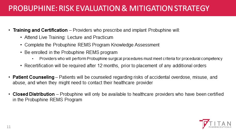 PROBUPHINE: U.S. COMMERCIALIZATION UPDATE* 10 • FDA approval, May 2016; First patients treated end of Q2 2016 • To date > 2,400 health care providers certified under the Probuphine REMS program • Over 70 payors have indicated that they intend to cover Probuphine • Braeburn is planning a full - scale commercial launch of Probuphine with a fully - deployed field force of approximately 60 representatives in the first quarter of 2017 * Source: Braeburn Pharmaceuticals, Inc. Form S - 1 filed with U.S. Securities and Exchange Commission on December 30, 2016