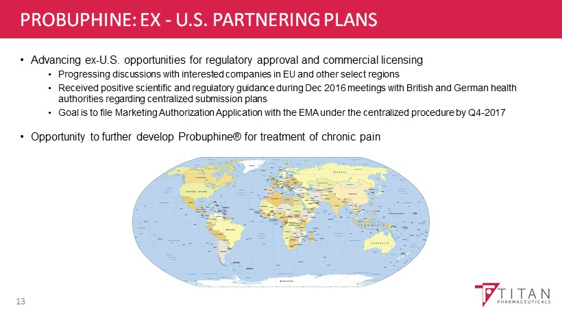 PROBUPHINE: EX - U.S. PARTNERING PLANS 13 • Advancing ex - U.S. opportunities for regulatory approval and commercial licensing • Progressing discussions with interested companies in EU and other select regions • Received positive scientific and regulatory guidance during Dec 2016 meetings with British and German health authorities regarding centralized submission plans • Goal is to file Marketing Authorization Application with the EMA under the centralized procedure by Q4 - 2017 • Opportunity to further develop Probuphine® for treatment of chronic pain