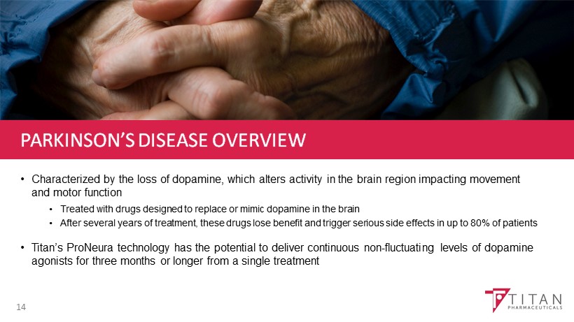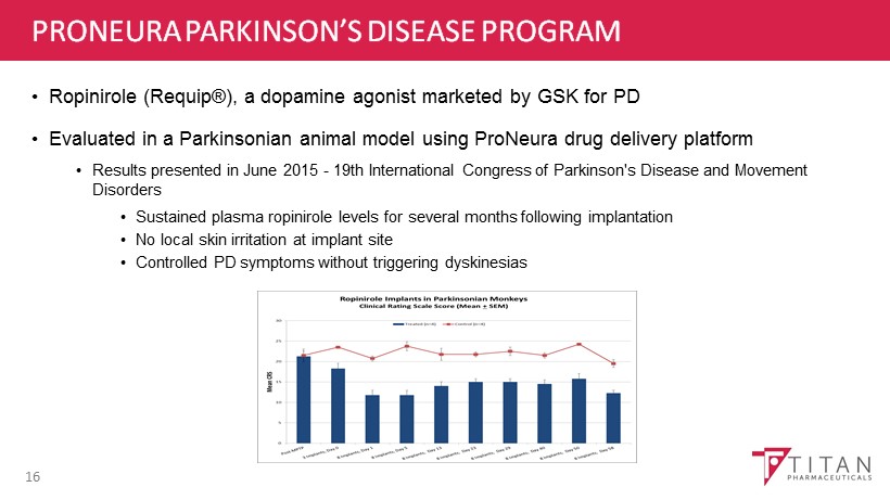 PARKINSON’S DISEASE – THERAPEUTICS MARKET 15 * GlobalData; **Parkinson’s Action Network, National Center for Health Statistics; “The Current and Projected Economic Burden of Parkinson’s Disease in the United States” Movement Disorders, March 2013 Based on information from Titan and other sources believed to be reliable and prepared exclusively for Titan. Woodside Capita l P artners is not responsible for any use that Titan may make of this material. Sales of Dopamine Agonists, U.S.* Year Total Sales % DA $ DA 2012 $1.1 Billion 26% $286 Million 2022 $2.3 Billion 18% $414 Million Cost to American Society ** $14.4 Billion Annually Treatment Costs $8.1 Billion Indirect Costs $6.3 Billion If costs continue to rise they will double by 2040 • As many as 1 million people in the US affected • That number is expected to almost double by 2030 due to aging of population • About 60 , 000 newly diagnosed for PD annually • More than 23 , 000 die from PD each year