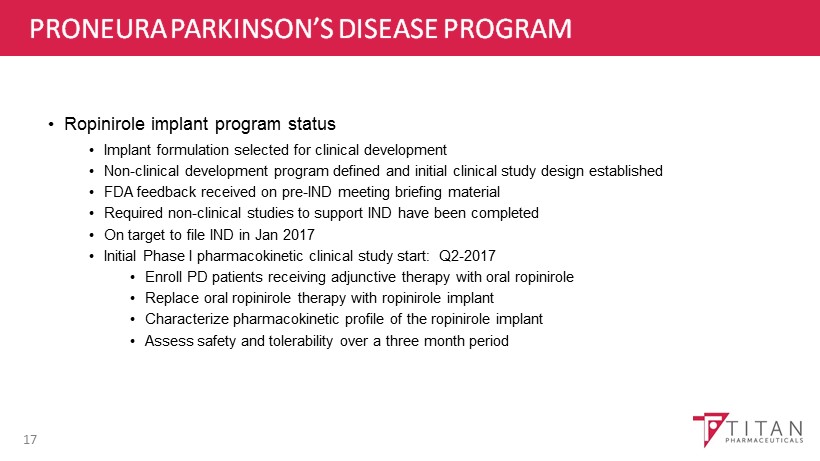 PRONEURA PARKINSON’S DISEASE PROGRAM 16 • Ropinirole (Requip®), a dopamine agonist marketed by GSK for PD • Evaluated in a Parkinsonian animal model using ProNeura drug delivery platform • Results presented in June 2015 - 19th International Congress of Parkinson's Disease and Movement Disorders • Sustained plasma ropinirole levels for several months following implantation • No local skin irritation at implant site • Controlled PD symptoms without triggering dyskinesias