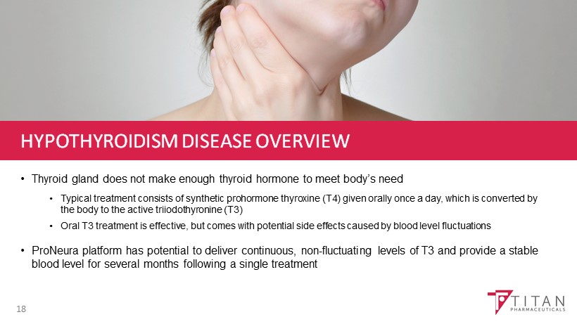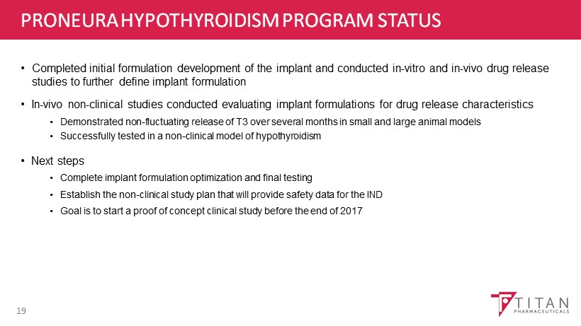 HYPOTHYROIDISM DISEASE OVERVIEW • Thyroid gland does not make enough thyroid hormone to meet body’s need • Typical treatment consists of synthetic prohormone thyroxine (T4) given orally once a day, which is converted by the body to the active triiodothyronine (T3) • Oral T3 treatment is effective, but comes with potential side effects caused by blood level fluctuations • ProNeura platform has potential to deliver continuous, non - fluctuating levels of T3 and provide a stable blood level for several months following a single treatment 18