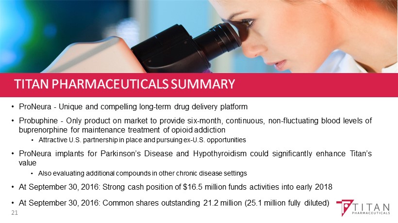 TITAN PHARMACEUTICALS SUMMARY • ProNeura - Unique and compelling long - term drug delivery platform • Probuphine - Only product on market to provide six - month, continuous, non - fluctuating blood levels of buprenorphine for maintenance treatment of opioid addiction • Attractive U . S . partnership in place and pursuing ex - U . S . opportunities • ProNeura implants for Parkinson’s Disease and Hypothyroidism could significantly enhance Titan’s value • Also evaluating additional compounds in other chronic disease settings • At September 30, 2016: Strong cash position of $16.5 million funds activities into early 2018 • At September 30 , 2016: Common shares outstanding 21.2 million (25.1 million fully diluted) 21
