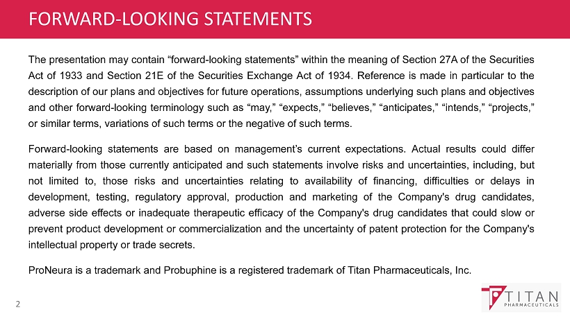 FORWARD - LOOKING STATEMENTS The presentation may contain “forward - looking statements” within the meaning of Section 27 A of the Securities Act of 1933 and Section 21 E of the Securities Exchange Act of 1934 . Reference is made in particular to the description of our plans and objectives for future operations, assumptions underlying such plans and objectives and other forward - looking terminology such as “may,” “expects,” “believes,” “anticipates,” “intends,” “projects,” or similar terms, variations of such terms or the negative of such terms . Forward - looking statements are based on management’s current expectations . Actual results could differ materially from those currently anticipated and such statements involve risks and uncertainties, including, but not limited to, those risks and uncertainties relating to availability of financing, difficulties or delays in development, testing, regulatory approval, production and marketing of the Company's drug candidates, adverse side effects or inadequate therapeutic efficacy of the Company's drug candidates that could slow or prevent product development or commercialization and the uncertainty of patent protection for the Company's intellectual property or trade secrets . ProNeura is a trademark and Probuphine is a registered trademark of Titan Pharmaceuticals, Inc . 2