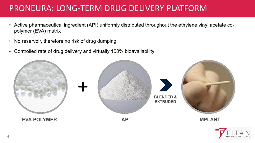 COMPANY SNAPSHOT 3 • Focus on proprietary therapeutics for select chronic diseases • ProNeura TM drug delivery platform provides long - term, continuous, non - fluctuating medication levels • FDA approved Probuphine ® (buprenorphine) implant – six - month maintenance treatment of opioid addiction • Large and growing market opportunity; Strong commercial partnership with Braeburn Pharmaceuticals • Initial product launch commenced Q3 - 2016 building to full launch in Q1 - 2017 • Growing pipeline: Parkinson’s D isease, Hypothyroidism and other chronic disease targets
