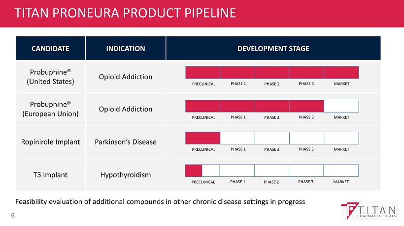 TITAN PRONEURA PRODUCT PIPELINE 6 CANDIDATE INDICATION DEVELOPMENT STAGE Probuphine ® (United States) Opioid Addiction Probuphine ® (European Union) Opioid Addiction Ropinirole Implant Parkinson’s Disease T3 Implant Hypothyroidism Feasibility evaluation of additional compounds in other chronic disease settings in progress PRECLINICAL PHASE 1 PHASE 2 PHASE 3 MARKET PRECLINICAL PHASE 1 PHASE 2 PHASE 3 MARKET PRECLINICAL PHASE 1 PHASE 2 PHASE 3 MARKET PRECLINICAL PHASE 1 PHASE 2 PHASE 3 MARKET