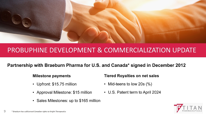 OPIOID ADDICTION: OPPORTUNITY FOR PROBUPHINE 8 • Major epidemic in the U.S. with an estimated 2.5 million people affected with this disease • Buprenorphine treatment is the gold standard as an effective, safer, and more convenient treatment option with 2016 annual U.S. sales of approximately $2.2 billion • Controls withdrawal symptoms and cravings without inducing opioid euphoria in patients • Convenient outpatient treatment allows take - home medication, unlike methadone • Low risk of respiratory depression versus other opiates • BUT, major challenges with daily dosed formulations persist • Compliance ; V ariable blood levels; Diversion & Abuse • Probuphine addresses all of these challenges and provides a unique treatment option 0 500 1,000 1,500 2,000 2,500 2011 2012 2013 2014 2015 2016 U.S. Buprenorphine Sales ($ Millions)