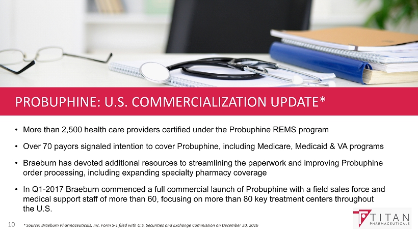 PROBUPHINE DEVELOPMENT & COMMERCIALIZATION UPDATE 9 Partnership with Braeburn Pharma for U.S. and Canada * signed in December 2012 * Braeburn has sublicensed Canadian rights to Knight Therapeutics Milestone payments • Upfront: $15.75 million • Approval Milestone: $15 million • Sales Milestones: up to $165 million Tiered Royalties on net sales • Mid - teens to low 20s (%) • U.S. Patent term to April 2024
