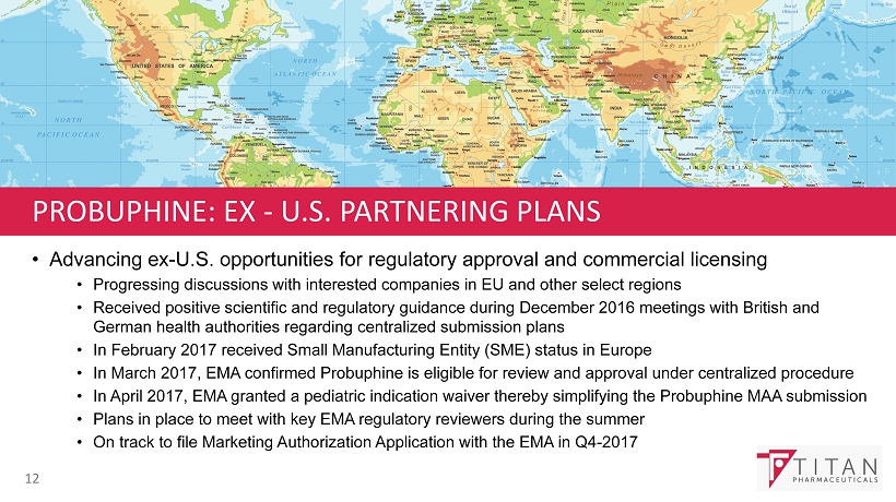 PROBUPHINE: GAINING AWARENESS 11 Recent Probuphine coverage includes: • New York Times • Fortune Magazine • CNBC • CBS • Drug Delivery Business News • WPIX - TV (New York, NY) • WMUR Channel 9 (Manchester, NH) • WHDT TV (Stuart, FL) Industry Recognition: • Popular Science ‘Best of What’s New’ • Stevie Awards ‘Best New Product’