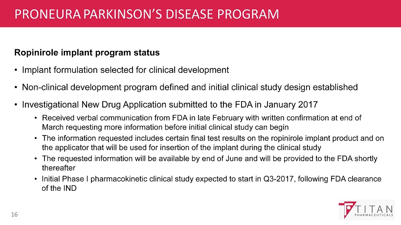 PRONEURA PARKINSON’S DISEASE PROGRAM 15 • Ropinirole (Requip®), a dopamine agonist marketed by GSK for PD • Evaluated in a Parkinsonian animal model using ProNeura drug delivery platform • Results presented in June 2015 - 19th International Congress of Parkinson's Disease and Movement Disorders • Sustained plasma ropinirole levels for several months following implantation • No local skin irritation at implant site • Controlled PD symptoms without triggering dyskinesias