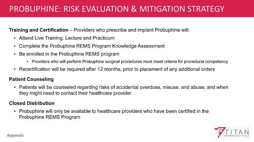 PROBUPHINE: RISK EVALUATION & MITIGATION STRATEGY Training and Certification – Providers who prescribe and implant Probuphine will: • Attend Live Training: Lecture and Practicum • Complete the Probuphine REMS P rogram K nowledge Assessment • Be enrolled in the Probuphine REMS program • Providers who will perform Probuphine surgical procedures must meet criteria for procedural competency • Recertification will be required after 12 months, prior to placement of any additional orders Patient Counseling • Patients will be counseled regarding risks of accidental overdose, misuse, and abuse, and when they might need to contact their healthcare provider Closed Distribution • Probuphine will only be available to healthcare providers who have been certified in the Probuphine REMS Program Appendix