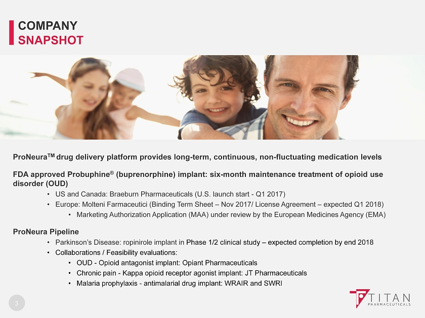 The presentation may contain “forward - looking statements” within the meaning of Section 27 A of the Securities Act of 1933 and Section 21 E of the Securities Exchange Act of 1934 . Reference is made in particular to the description of our plans and objectives for future operations, assumptions underlying such plans and objectives and other forward - looking terminology such as “may,” “expects,” “believes,” “anticipates,” “intends,” “projects,” or similar terms, variations of such terms or the negative of such terms . Forward - looking statements are based on management’s current expectations . Actual results could differ materially from those currently anticipated and such statements involve risks and uncertainties, including, but not limited to, those risks and uncertainties relating to the commercialization of Probuphine, the regulatory approval process, the development, testing, production and marketing of our drug candidates, patent and intellectual property matters and strategic agreements and relationships . ProNeura is a trademark and Probuphine is a registered trademark of Titan Pharmaceuticals, Inc . 2 FORWARD - LOOKING STATEMENTS