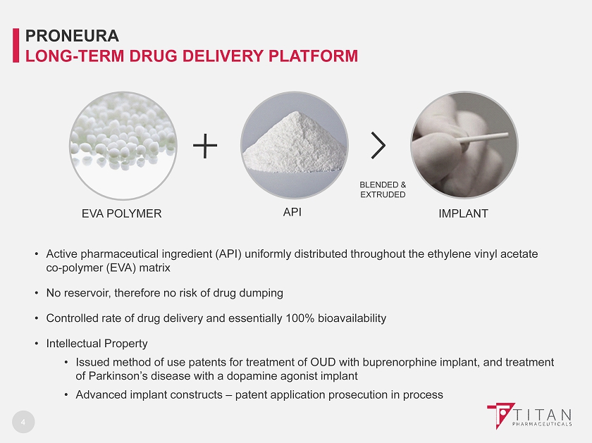3 ProNeura TM drug delivery platform provides long - term, continuous, non - fluctuating medication levels FDA approved Probuphine ® (buprenorphine) implant: six - month maintenance treatment of opioid use disorder (OUD) • US and Canada: Braeburn Pharmaceuticals (U.S. launch start - Q1 2017) • Europe: Molteni Farmaceutici (Binding Term Sheet – Nov 2017/ License Agreement – expected Q1 2018) • Marketing Authorization Application (MAA) under review by the European Medicines Agency (EMA) ProNeura Pipeline • Parkinson’s Disease: ropinirole implant in Phase 1/2 clinical study – expected completion by end 2018 • Collaborations / Feasibility evaluations: • OUD - Opioid antagonist implant: Opiant Pharmaceuticals • Chronic pain - Kappa opioid receptor agonist implant: JT Pharmaceuticals • Malaria prophylaxis - antimalarial drug implant: WRAIR and SWR I COMPANY SNAPSHOT