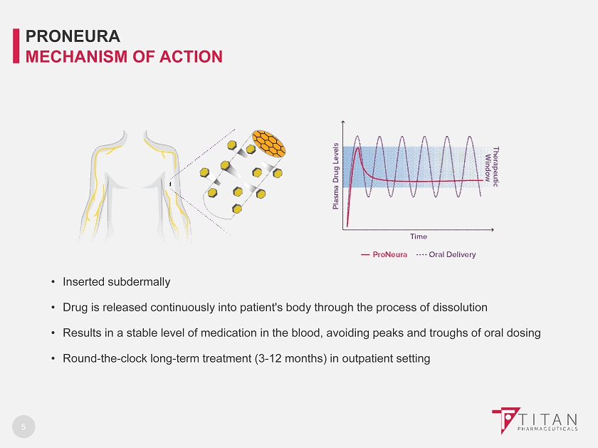 4 • Active pharmaceutical ingredient (API) uniformly distributed throughout the ethylene vinyl acetate co - polymer (EVA) matrix • No reservoir, therefore no risk of drug dumping • Controlled rate of drug delivery and essentially 100 % bioavailability • Intellectual Property • Issued method of use patents for treatment of OUD with buprenorphine implant, and treatment of Parkinson’s disease with a dopamine agonist implant • Advanced implant constructs – patent application prosecution in process EVA POLYMER API IMPLANT BLENDED & EXTRUDED PRONEURA LONG - TERM DRUG DELIVERY PLATFORM