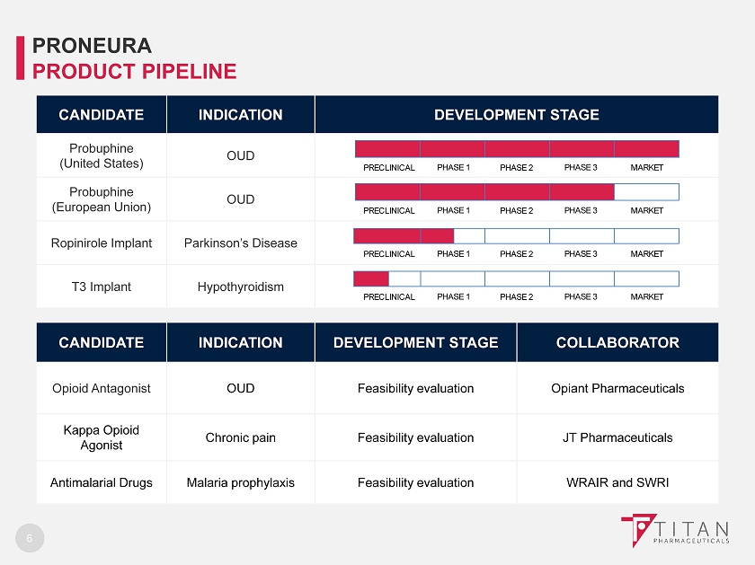5 • Inserted subdermally • Drug is released continuously into patient's body through the process of dissolution • Results in a stable level of medication in the blood, avoiding peaks and troughs of oral dosing • Round - the - clock long - term treatment (3 - 12 months) in outpatient setting PRONEURA MECHANISM OF ACTION