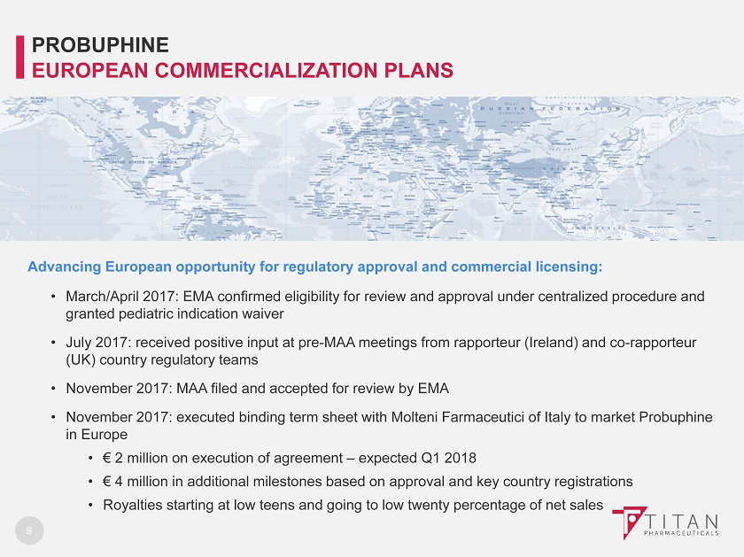 8 Partnership with Braeburn Pharmaceuticals for U.S. and Canada* • Tiered royalties on net sales of m id - teens to low 20s (%) - U.S. Patent term to April 2024 • Sales Milestones of up to $165 million • Braeburn launched with 60+ field sales force and medical support staff focusing on 80+ key U.S. treatment centers • 2,500 + health care providers certified under REMS program and 70+ payors indicated coverage intention, including Medicare, Medicaid & VA programs • Ongoing discussions with Braeburn, medical community and other experts to fully understand impediments to Probuphine’s uptake and establish action plans to address issues * Braeburn has sublicensed Canadian rights to Knight Therapeutics PROBUPHINE U.S . COMMERCIAL LAUNCH INITIATED Q1 2017