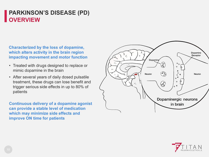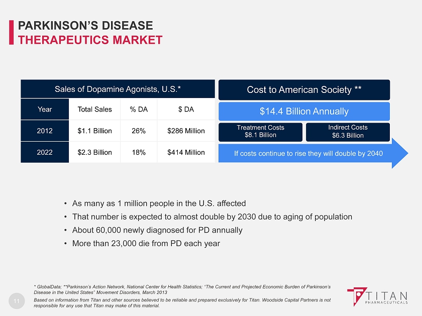 Characterized by the loss of dopamine, which alters activity in the brain region impacting movement and motor function • Treated with drugs designed to replace or mimic dopamine in the brain • After several years of daily dosed pulsatile treatment, these drugs can lose benefit and trigger serious side effects in up to 80% of patients Continuous delivery of a dopamine agonist can provide a stable level of medication which may minimize side effects and improve ON time for patients 10 PARKINSON’S DISEASE (PD) OVERVIEW